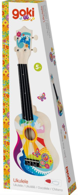 Ideální pro začátečníky. S trsátkem a čtyřmi náhradními strunami. Rozměry: 53 x 17 x 6 cm.