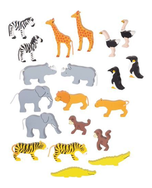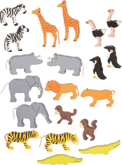 Sada 10 druhů dřevěných zvířat v páru se skvěle hodí pro hraní na safari, zoo, divočinu nebo ke hře o potopě světa a Noemově arše. Vyrobeno ze dřeva a ošetřeno nezávadnými barvami. Výška zvířátek: 3,5 - 7,5 cm. Balení obsahuje 20 ks.
