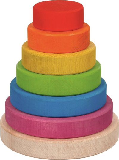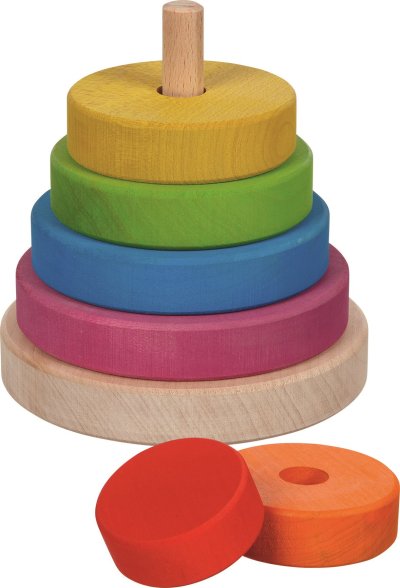 Dřevěná skládací věž podporující vývoj motorických schopností dítěte. Dřevěné kroužky se navlékají na tyčku od největšího k nejmenšímu. Tímto úkolem trénují děti jemnou motoriku, trpělivost v řešení složitějších zadání, v neposlední řadě také chápání barev a tvarů. Rozměry hračky: výška 13 cm, průměr 11cm. Vhodné pro děti od 2 let.