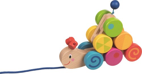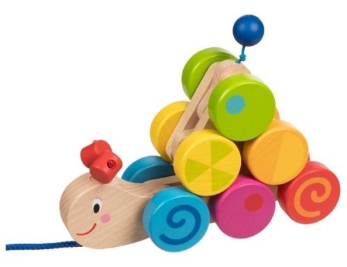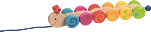 Duhově barevná housenka, vyrobeno z masivního dřeva, pohybující se skvěle sladěná kola hrají barvami, jednotlivé články lze poskládat do podoby pyramidy a složenou tahat, umí bravurně překonávat překážky, podporuje motoriku a smysl pro rovnováhu, hračka je věrným společníkem pro první výlety dítěte.