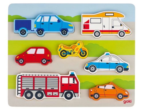 rozvoj koordinace oko-ruka, logického myšlení a představivosti, dřevěná podložka usnadňuje skládání a rámečky zabezpečují, aby jednotlivá dřevěná auta držela na svých místech, vkládací dílky mohou sloužit i jako figurka na hraní.