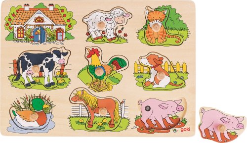 Dřevěné zvukové puzzle s obrázky domácích zvířátek. Osm domácích zvířátek vydává po vložení charakteristický zvuk. Jednotlivé dílky mají dřevěné úchytky pro snazší manipulaci.