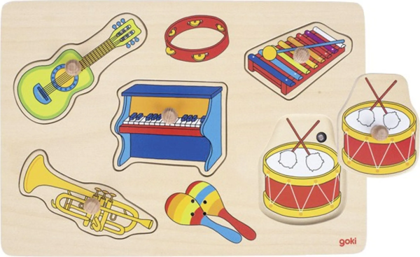 Dřevěné zvukové puzzle s obrázky hudebních nástrojů. Po vložení obrázku se ozve charakteristický zvuk.