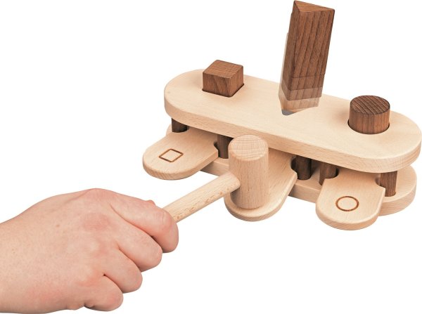 Do kterého katapultu musí kladivo udeřit, aby se dřevěná cihla ve tvaru trojúhelníku dostala ven? Zábavná hra pro malé koumáky ve stylu akce - reakce. GOKI patří mezi nejvýznamnější evropské výrobce hraček s vysokou pedagogickou a didaktickou kvalitou. Firma klade důraz na bezpečnost hraček, jejich zdravotní nezávadnost a dbá na obnovitelné zdroje. Dřevo je bráno tam, kde může dorůstat. Používané dřeviny jsou javor, buk, ořech, lípa, jasan, borovice, bříza a gumovník. Barvy a laky ředitelné vodou pocházejí od menších výrobců.