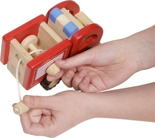 Dřevěné hasičské auto s navijákem, gumová kola, použité barvy jsou zdravotně nezávadné, rozměry: 17,5 x 9,4 x 12 cm