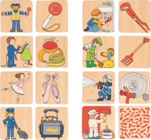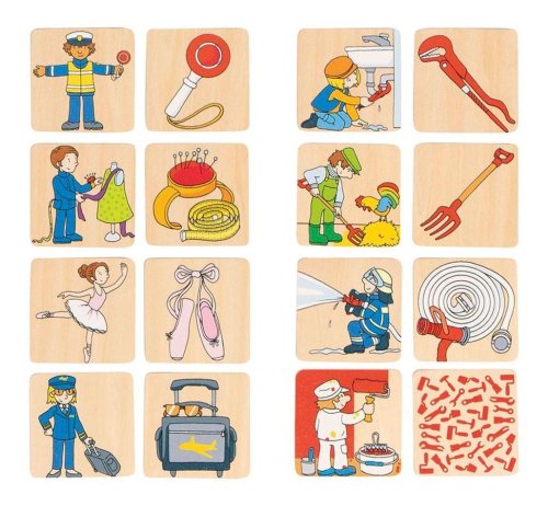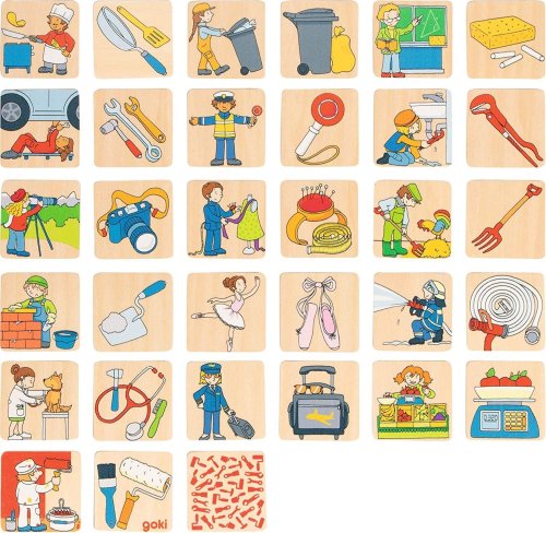 Profese a povolání to je párování kartiček s různými obrázky patřícími k sobě např. požárník + požární hadice, baletka + baletní střevíčky, kuchař + pánvička atd. Pexeso je na dřevěných kartičkách a můžete být jisti, že nebude mít ohnuté rožky ani při dlouhodobém používání. Skvělá hra pro cvičení paměti pro rodiče i pro děti. Balení obsahuje: 32 kartiček (5 x 5 x 0,5 cm), návod. GOKI patří mezi nejvýznamnější evropské výrobce hraček s vysokou pedagogickou a didaktickou kvalitou. Firma klade důraz na bezpečnost hraček, jejich zdravotní nezávadnost a dbá na obnovitelné zdroje. Dřevo je bráno tam, kde může dorůstat. Používané dřeviny jsou javor, buk, ořech, lípa, jasan, borovice, bříza a gumovník. Barvy a laky pocházejí od menších výrobců.