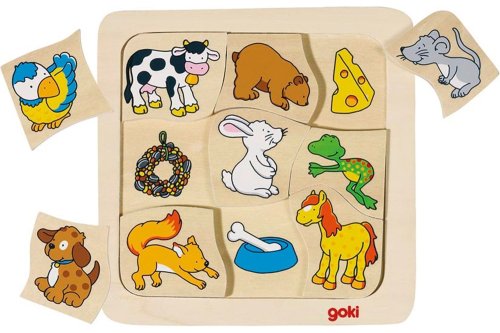 Dětské skládačkaze dřeva. Dílky jsou umístěny na dřevěné desce s vyfrézovaným obrysem pro usnadnění skládání. Skládání puzzle rozvíjí fantazii a podporuje rozvoj motoriky. Doporučeno pro děti od 2 let. GOKI patří mezi nejvýznamnější evropské výrobce hraček s vysokou pedagogickou a didaktickou kvalitou. Firma klade důraz na bezpečnost hraček, jejich zdravotní nezávadnost a dbá na obnovitelné zdroje. Dřevo je bráno tam, kde může dorůstat. Používané dřeviny jsou javor, buk, ořech, lípa, jasan, borovice, bříza a gumovník. Barvy a laky pocházejí od menších výrobců. Rozměr složeného puzzle cca 18 x 18 cm