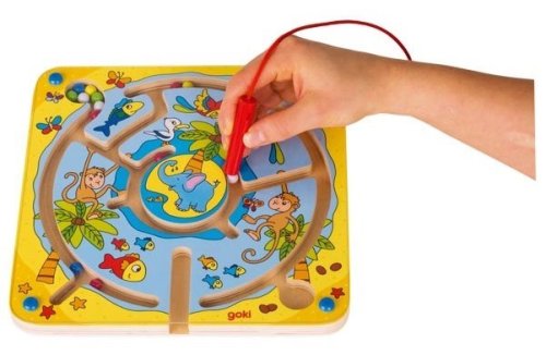 Barevná magnetická hra Ostrov potěší každé dítě a vybízí ke hře. K desce je připevněna magnetická tyč na provázku, se kterou by se kuličky měly pohybovat. Kuličky lze vést celým bludištěm dvěma způsoby. Prvním způsobem (tradičně) - pomocí magnetické „tyče“, která vyžaduje, aby se dítě soustředilo Druhým způsobem - k různým cílům, rozdělit dle barev. Hračka je vyrobena ze dřeva, bludiště a kuličky jsou za pevným a průhledným plexisklem. Hra procvičuje koordinaci ruka - oko a jemnou motoriku. Vhodné pro děti od 18 měsíců. Rozměry hračky: 21 x 21 x 1,7 cm GOKI patří mezi nejvýznamnější evropské výrobce hraček s vysokou pedagogickou a didaktickou kvalitou. Firma klade důraz na bezpečnost hraček, jejich zdravotní nezávadnost a dbá na obnovitelné zdroje. Dřevo je bráno tam, kde může dorůstat. Používané dřeviny jsou javor, buk, ořech, lípa, jasan, borovice, bříza a gumovník. Barvy a laky pocházejí od menších výrobců.
