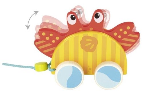 Pohybující se krab v hromádce písku, kolečka připomínají hravé mořské vlnky, vyrobeno z masivního dřeva, podporuje motoriku a smysl pro rovnováhu, hračka je věrným společníkem pro první výlety dítěte.