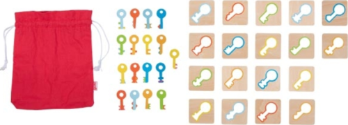 Balení obsahuje : bavlněný pytlík, 16 ks klíčů a 16 ks destiček 5x5cm, návod. GOKI patří mezi nejvýznamnější evropské výrobce hraček s vysokou pedagogickou a didaktickou kvalitou. Firma klade důraz na bezpečnost hraček, jejich zdravotní nezávadnost a dbá na obnovitelné zdroje. Dřevo je bráno tam, kde může dorůstat. Používané dřeviny jsou javor, buk, ořech, lípa, jasan, borovice, bříza a gumovník. Barvy a laky pocházejí od menších výrobců.