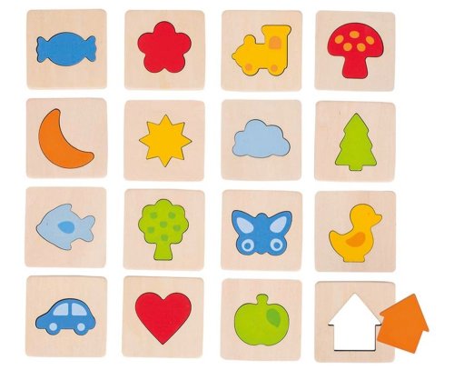 Hra je vyrobena ze dřeva, 16 rámečků z přírodního dřeva (5,9 x 5,9 cm) a 16 barevných vyřezávaných obrázků, hra stimuluje hmat a smyslové vjemy, rámečky se rozdělí mezi hráče a poskládají na stůl, dílky ve tvaru předmětů zůstanou v pytlíku a hráči se postupně bez dívání, pouze po hmatu, pokusí v pytlíku najít tvar do svých rámečků, lze hrát i obráceně, hracích variant je několik.