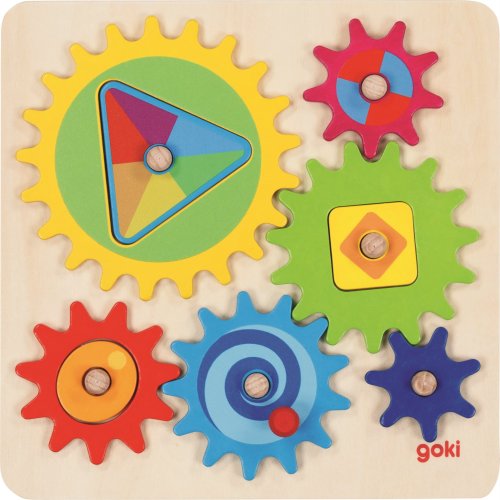 Skládání barevných dřevěných ozubených kol na podložku je jen polovina zábavy. Teprve po umístění modrého kola se ukáže zda plán vyšel - otáčí se všechna kola? A kterým směrem se otáčejí?