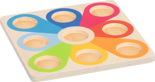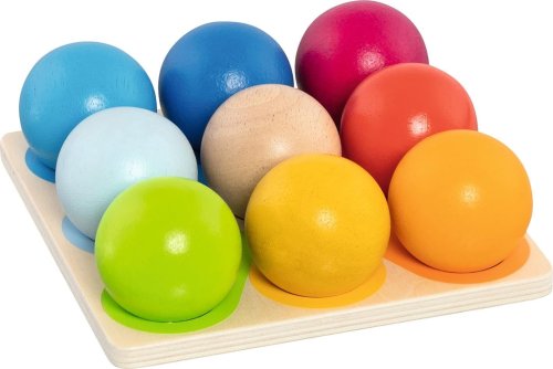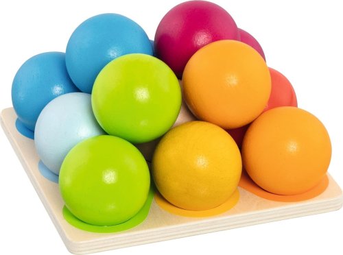 Čtrnáct krásně velkých a barevných kuliček, které mají široké využití ve světě dětí. Děti se učí barvy pojmenovat, třídit je k sobě a správně přiřadit na podkladovou desku. Skládání pyramidy do výšky nabízí různé kombinace a podporuje tak fantazii a cit pro barvy. Samozřejmě trénuje také motorické dovednosti a trpělivost. A protože se z podstaty věci kutálí, nenechají děti sedět na místě. Vyrobeno ze dřeva. Kulička má průměr 4,6 cm, hrana podkladové desky 15 cm. Vhodné od 1 roku. GOKI patří mezi nejvýznamnější evropské výrobce hraček s vysokou pedagogickou a didaktickou kvalitou. Firma klade důraz na bezpečnost hraček, jejich zdravotní nezávadnost a dbá na obnovitelné zdroje. Dřevo je bráno tam, kde může dorůstat. Používané dřeviny jsou javor, buk, ořech, lípa, jasan, borovice, bříza a gumovník. Barvy a laky pocházejí od menších výrobců.