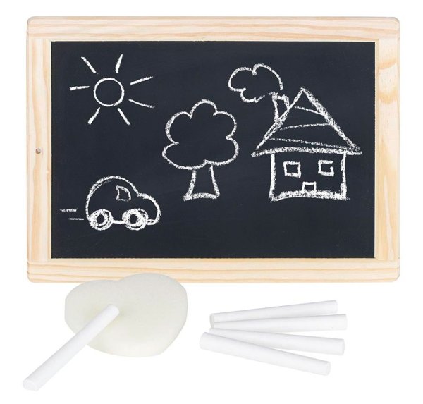 Černá břidlicová tabulka v dřevěném rámu je oboustranná. Vhodná pro kreslení, psaní, počítání, zapisování seznamů a plánů. V kratší straně rámu je provrtán otvor pro zavěšení. Rozměry: 25,8 x 18,7 x 0,7 cm .