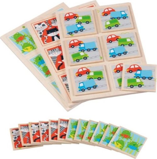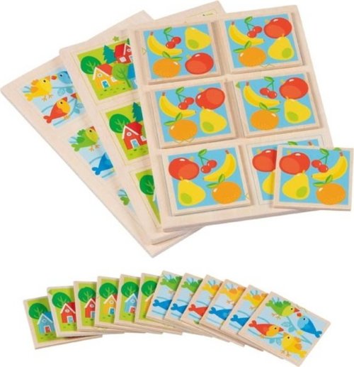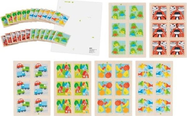 Obrázky na dřevěných kartičkách se liší jen nepatrně. Rozvíjí paměťové a smyslové dovednosti, komunikační schopnosti a spolupráci.