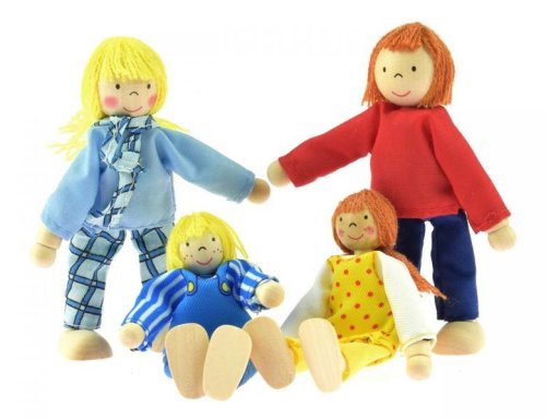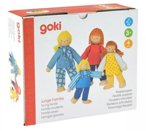 Dřevěné panenky jsou pohyblivé, mohou sedět, stát nebo ležet. Hodí se do domečků nebo pro samostatné hraní. Vhodné do všech domečků pro panenky značky Goki. Použitý materiál: dřevo, drát, různé druhy textilií. Výška panenek: 10 - 12 cm. Balení obsahuje 4 ks: maminku, tatínka, dceru a syna.