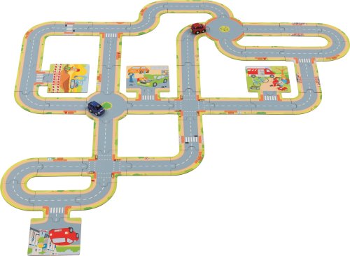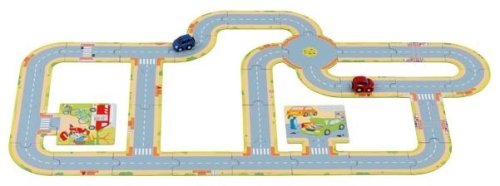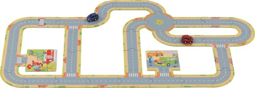 45 libovolně sestavitelných dílů : zatáčky, křižovatky, 2 parkovací plochy, kruhový objezd Ø 14 cm, rovné úseky (šířka 7 cm), atd. Děti si mohou vytvořit závodní nebo jízdní dráhu. Součástí balení jsou 2 kovová autíčka .
