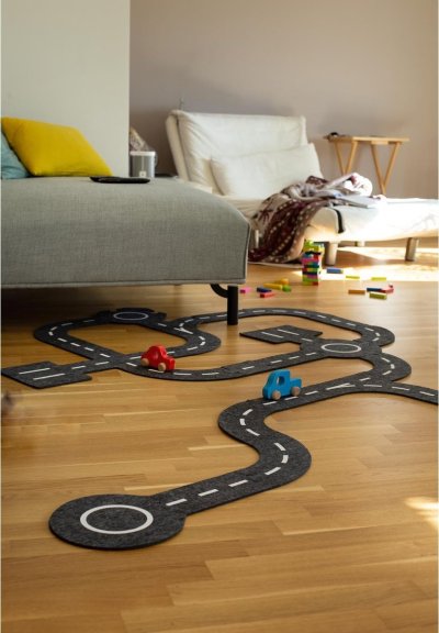 Variabilní hrací puzzle z filcového materiálu. Díly můžou děti libovolně napojovat a vytvořit pokaždé jinou dráhu. Podlahové puzzle má 30 dílků různých tvarů, na kterých jsou zobrazeny silnice, zatáčky, kruhové objezdy či parkoviště. Výsledná velikost a tvar skládačky je podle Vaší fantazie. Při zakoupení více sad můžete s dětmi vytvářet velkou silniční infrastrukturu, která je omezená pouze velikostí vašeho pokoje. Součástí balení jsou také dvě dřevěná autíčka. Šířka dílků je 11 cm a tloušťka dílku je 0,5 cm.