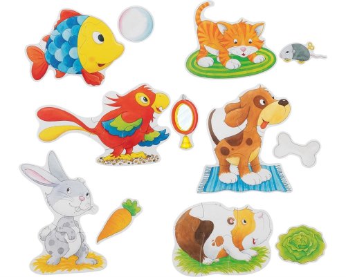 Poskládej si obrázky domácích mazlíčků a pusť se do přiřazování. Ke každému zvířátku patři dílek, který je pro dané zvířátko typický. Poznáš, ke komu patřím mrkev? A kdo si rád hraje s natahovací myškou?