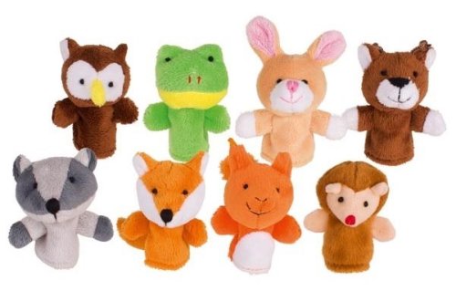8 lesních zvířátek - plyšových maňásků, podporují kreativitu, představivost a rozvíjí řečnické schopnosti, lze prát při max 30°C, výška: 7,5 - 8,5 cm.