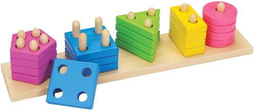 Třídění barev a tvarů kombinované s různým počtem otvorů pro nasouvání na stejně vysoké kolíky.