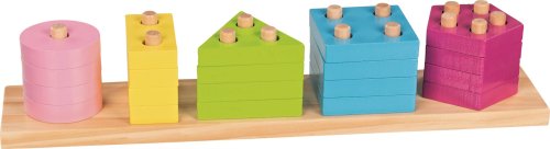 Rozměr: 35 x 7 x 7,5 cm. Obsahuje: základovou desku, 20 ks různých tvarů. GOKI patří mezi nejvýznamnější evropské výrobce hraček s vysokou pedagogickou a didaktickou kvalitou. Firma klade důraz na bezpečnost hraček, jejich zdravotní nezávadnost a dbá na obnovitelné zdroje. Dřevo je bráno tam, kde může dorůstat. Používané dřeviny jsou javor, buk, ořech, lípa, jasan, borovice, bříza a gumovník. Barvy a laky pocházejí od menších výrobců.