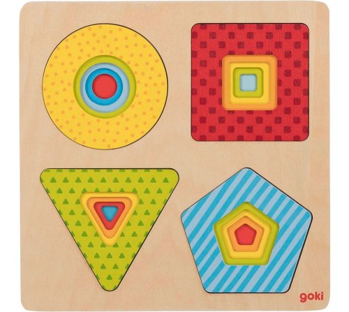 Vícevrstvá vkládačka 4v1 s motivem barevných geometrických tvarů. Skládačka obsahuje pět dílků. Výhody: