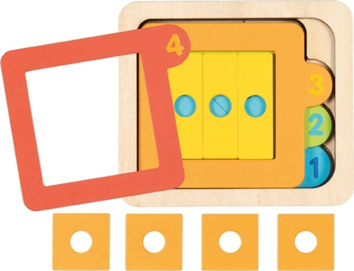 podpora rozvoje logiky, rozpoznávání barev, seznamování se s číslicemi, podkladová deska s pevným okrajem slouží jako podložka pro skládání, jednotlivé vrstvy obsahují vyjímatelnou rámeček s čísly a tvary v různé kombinaci odpovídající danému číslu.