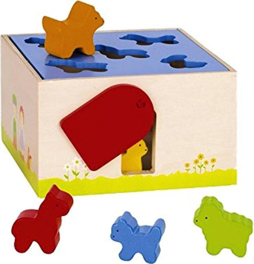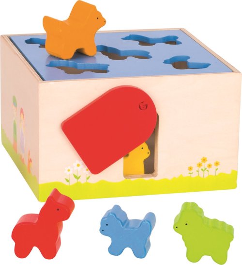 Dřevěná krabička s otevíracím víkem na třídění barevných tvarů je ideální pro nejmenší děti a jejich počáteční zkoumání otvorů a tvarů.