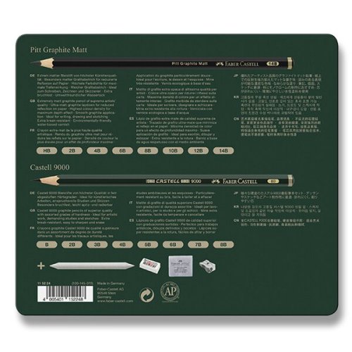 SLOŽENÍ:, * grafitová tužka Pitt Graphite Matt HB, * grafitová tužka Pitt Graphite Matt 2B, * grafitová tužka Pitt Graphite Matt 4B, * grafitová tužka Pitt Graphite Matt 6B, * grafitová tužka Pitt Graphite Matt 8B, * grafitová tužka Pitt Graphite Matt 10B, * grafitová tužka Pitt Graphite Matt 12B, * grafitová tužka Pitt Graphite Matt 14B, * grafitová tužka Castell 9000 B, * grafitová tužka Castell 9000 2B, * grafitová tužka Castell 9000 3B, * grafitová tužka Castell 9000 4B, * grafitová tužka Castell 9000 5B, * grafitová tužka Castell 9000 6B, * grafitová tužka Castell 9000 7B, * grafitová tužka Castell 9000 8B, * ořezávátko, * těrka papírová, * umělecká pryž, * pryž, TIP: Ke kreslení můžete potřebovat i umělecké papíry.