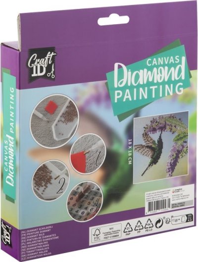 Postup: Horní strana plátna je potažena folií s lepicí vrstvou. Sundávejte ji postupně po částech tak, jak budete aplikovat kamínky. Při sejmutí celé folie najednou se může lepicí vrstva znečistit a kamínky by nemusely tak dobře držet. Plátno obsahuje číslice nebo znaky, které odkazují na příslušný sáček s kamínky označený číslem. Kamínky z daného sáčku vysypejte do misky. Do hrotu pera naberte vosk, díky kterému se kamínky snadno přichytí na pero. Kamínky perem aplikujte na obrázek. Po nalepení dané barvy kamínky nasypejte zpět do sáčku a pokračujte s další barvou. Součástí balení je i dřevěný rám, na kterém je plátno s potiskem nataženo. Rozměr tohoto rámečku je 18x18cm.