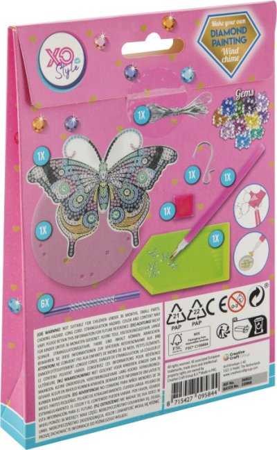 Balení obsahuje: zvonkohru, pero na aplikaci kamínků, miska na vysypání kamínků, vosk na nalepení, sadu barevných kamínků Diamantové malování - postup: Zvonkohra je potažena lepidlem a překrytá průhlednou folií. Kamínky požadované barvy vysypejte do misky. Do hrotu pera naberte vosk, díky kterému se kamínky snadno přichytí na pero, a nanášejte na obrázek.