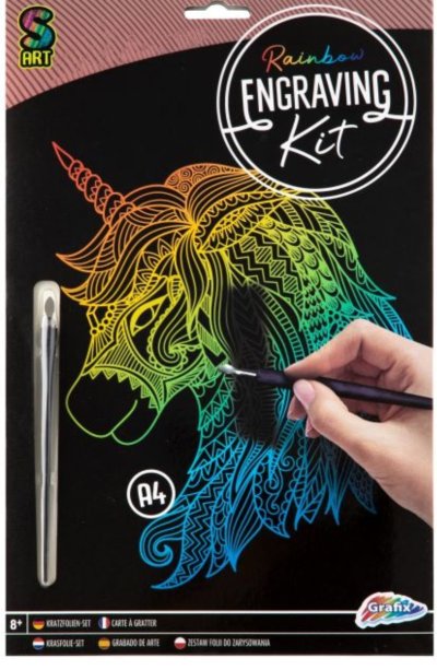 Zábava s barevným koncem! Škrabací obrázky probouzí kreativitu a nadšení a nejen malé výtvarníky zaměstnají na dlouhé hodiny. Papír potažený černou vrstvou překrývá podklad s duhovým efektem.  Přiloženým škrabacím perem vyškrábejte linky předtištěného obrázku. Fantazii se meze nekladou, proto je možné vyškrábat i černá místa bez potisku a dodat obrázku osobitý rámeček. Obsah balení:
