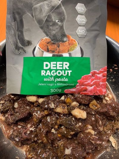Složení: 85 % jelení maso, 10 % těstoviny, 5 % mrkev