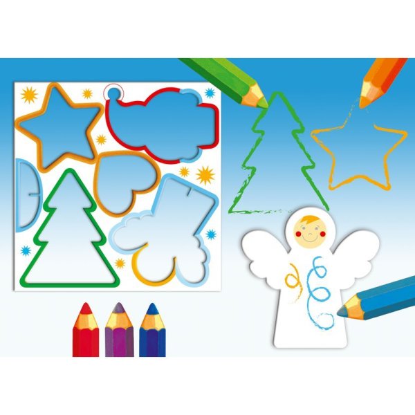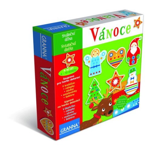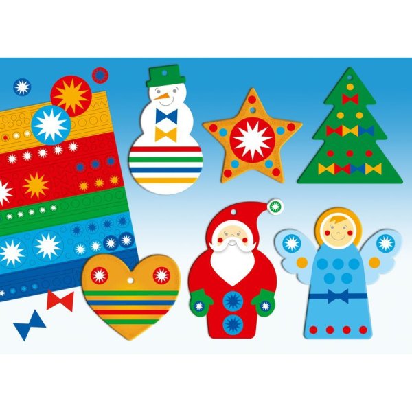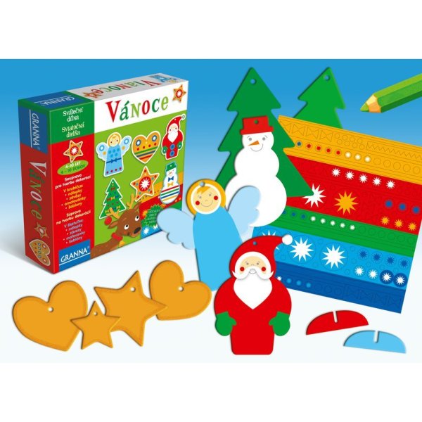 Tematicky zaměřená kreativní souprava, díky které si děti mohou vytvořit nádherné dekorativní vánoční ozdoby. Mikulášové, sněhuláci, andílci, perníčky a stromečky v několika velikostech čekají na čtyřech arších ze silného, pevného kartonu. Z jedné strany jsou tyto motivy barevné a k jejich ozdobení slouží přiložený aršík barevných nálepek různých tvarů. Z druhé strany jsou všechny tvary bílé a poskytují dětem prostor pro tvořivou práci s pastelkami, fixy apod., a to jak podle přiložených vzorů, tak na základě vlastní fantazie. Některé dekorace je možné díky přiloženým stojánkům postavit, jiné zavěsit (šňůrky nejsou součástí balení). Po vytlačení jednotlivých motivů z archů umožňuje sada i další využití – všechny čtyři archy lze použít jako šablony, s jejichž pomocí si děti mohou všechny motivy překreslovat na libovolný podklad a vytvářet tak nekonečné množství vlastních ozdob s nejrůznějším dekorem. Dětsky jednoduchý recept na skvělé dekorace:1. Vybraný tvar ozdobte pastelkami nebo přiloženými nálepkami. 2. Dekorace je možné zavěsit nebo postavit do přiložených stojánků. Hotovo! Vánoční svátky jsou kouzelné období. Jen těžko si je můžeme představit bez stromečku, perníčků nebo třeba sněhuláků! V krabičce najdete připravené tvary ze silného kartonu a mnoho barevných nálepek. Každé dítě si tak bude moci snadno a rychle vytvořit výjimečné vánoční dekorace podle přiložených vzorů či vlastní fantazie! Obsah balení: 1 velký stromeček k postavení 2 menší stromečky k zavěšení3 větší figurky (Mikuláš, andílek a sněhulák) do stojánku6 figurek ve dvou velikostech (2 Mikulášové, 2 andílci a 2 sněhuláci) k zavěšení6 perníčků ve třech velikostech (3 srdíčka a 3 hvězdičky) k zavěšení3 stojánky4 archy šablon (vzniknou po vytlačení jednotlivých motivů)1 arch s barevnými samolepkami Hlavní vlastnosti: rozvíjí pozorovací schopnosti a rozšiřuje slovní zásobuzdokonaluje jemnou motoriku a prostorovou představivost Dokumentace: návod ke hře CZ