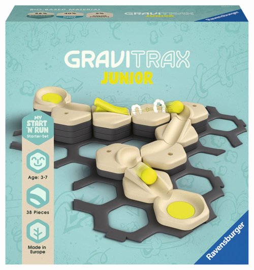 GraviTrax Junior je interaktivní systém kuličkové dráhy pro děti od 3 let. Ti nejmenší si staví své vlastní světy z kuličkových drah, které lze podle libosti zdobit a vytvářet tak jednotlivé tematické světy. Děti si tak při kreativním stavění užijí mnoho zábavy. GraviTrax Junior Startovní sada Start je ideálním startovním setem a vstupem do světa GraviTrax Junior. Dívky a chlapci od 3 let si staví své vlastní světy kuličkových drah. Všechny součásti jsou vyrobeny z dřevěného bioplastu. Startovní sadu Start lze rozšířit o doplňky, další startovní nebo rozšiřující sady. Lze ji také zkombinovat s tematickou sadou a přeměnit ji tak na tematický svět.