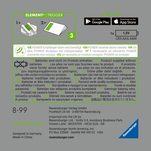 Spouštěč, akční doplněk vysílající signály. Odesílá signály do přijímačů na zvoleném kanálu. Propojení doplňků můžete ovlivnit pomocí Ovladače elektronických doplňků. Po projetí kuličky Spouštěčem do Přistávací Arény se vypustí na dráhu nová kulička ze Startéru. Projetí kuličky Spouštěčem také ovlivní přepnutí Výhybky. Vytvářejte pokročilejší dráhy s větším množstvím Spouštěčů - více Spouštěčů = více možností, více vyslaných signálů. Kompatibilní s ostatními doplňky GraviTrax Power. Lze zapojit do všech stavebních prvků z ostatních řad GraviTrax.