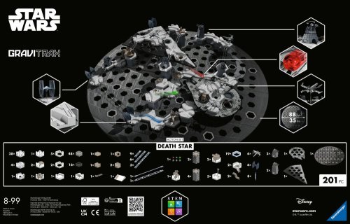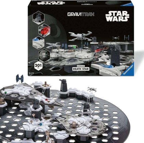 "GraviTrax Startovní sada Star Wars: Hvězda smrti - Zažijte epickou a velkolepou bitvu mezi dobrou a temnou stranou Hvězdných válek zblízka se systémem kuličkové dráhy GraviTrax. Akční vesmírné souboje ožívají s touto startovní sadou GraviTrax Star Wars: Hvězda smrti. Umožní vám objevit legendární střetnutí Impéria a Povstalců z Hvězdných válek. Díky prvkům a komponentům GraviTrax v exkluzivním designu Star Wars si můžete vytvořit vlastní vzrušující dráhy GraviTrax. V této sadě se základní deska GraviTrax představuje v působivém tvaru Hvězdy smrti, která do dráhy GraviTrax vnáší fascinaci a dobrodružství Hvězdných válek. Ponořte se do vzrušující galaxie plné akce a vzrušení. Ponořte se do fascinující galaxie Star Wars s prvky speciálně upravenými do podoby Star Wars. Výškové desky ve tvaru legendárních vesmírných lodí, zakřivené kostky s charakteristickými strukturami Hvězdy smrti a mnoho akčních prvků v nových barvách dělají z dráhy GraviTrax epické dobrodružství. Součástí stavebnice GraviTrax Star Wars: Hvězda smrti jsou exkluzivní figurky stíhaček X-Wing a TIE Fighter, které lze do dráhy dokonale začlenit. Vytvořte si vlastní epické momenty začleněním těchto ikonických vesmírných lodí do akčních kaskadérských kousků a triků na kuličkové dráze. GraviTrax je flexibilně rozšiřitelný interaktivní systém kuličkových drah pro děti od 8 let. Se stavebnicí GraviTrax si děti, teenageři i dospělí nestaví jen jednoduché kuličkové dráhy. Vytvářejí jedinečné světy kuličkových drah. Volným navrhováním kuličkových drah a zkoumáním chování kuliček na dráze se hravou formou seznamují s fyzikálními zákony. "
