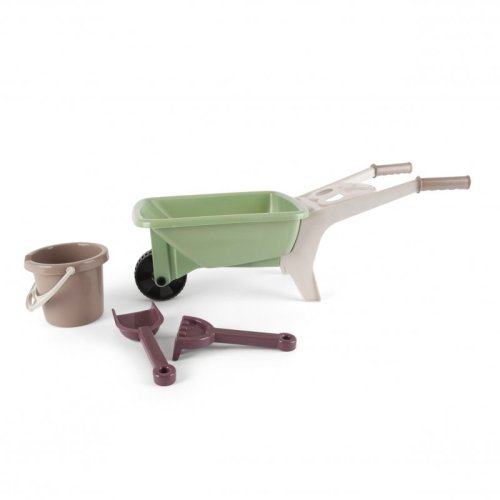 zahradnické kolečko s kyblíkem, lopatičkou a hrabičkami v krásných, jemných barvách