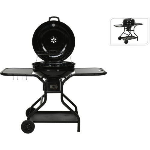 bbq kotel 22 palců s bočními křídly, celkový rozměr 130x65x95cm, rozměr víka 58,5cmx0,6mm, rozměr ohniště 57cmx0,6mm povrchová úprava černý smalt, vše ostatní matný černý práškový lak, výška vaření 82-96cm, s teploměrem, všechny nožičky průměr 32mm, grilovací rošt chromovaný, gril na dřevěné uhlí elektroforézní povrchová úprava, spodní deska 69x45,5cm, tloušťka 0,6mm