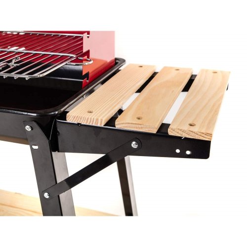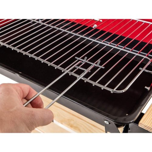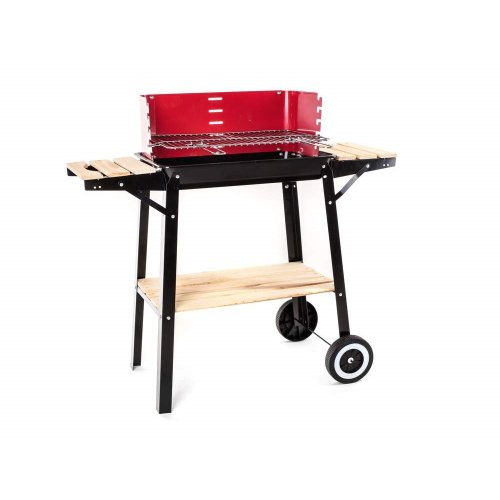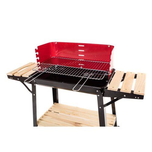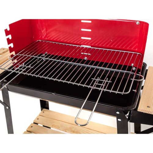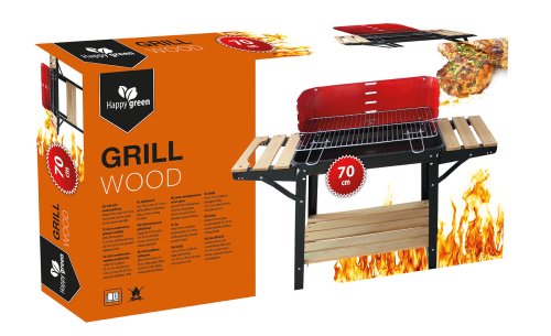 Gril WOOD má smaltovanou vanu s roštem z pochromované oceli. Gril je vybaven zástěnou proti větru, dvěma bočními odkládacími stolky a praktickou spodní odkládací plochou z dřevěných latí.