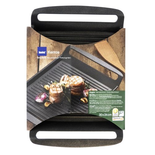 • grilovací deska je ideální k přípravě zeleniny, masa, uzenin, steaků, burgerů nebo ryb, následně lze jakékoliv suroviny zapékat v troubě a připravit tak celý oběd nebo večeři na jednom kusu nádobí- speciálně vyvinutý antiadhézní povrch GREBLON C3+- tento 3vrstvý nepřilnavý povrch je charakteristický svou nepřilnavostí, žádné potraviny se nepřipalují a čištění desky je tak velmi snadné- zároveň je vhodný pro zdravé vaření s minimem tuku, v závislosti na použitých surovinách klidně i úplně bez tuku- zesílené nerezové indukční dno pro maximální efektivitu smažení nebo restování- energeticky úsporné vaření zajišťuje kvalitní robustní korpus ze silného litého hliníku, který se rychle nahřívá po celém povrchu a má vynikající tepelnou vodivost- masivní lité rukojeti s dokonalým přechodem bez šroubů nebo jiných spojů, nemohou se uvolnit ani zlomit- deska je vhodná na všechny druhy sporáků i na indukci- vysoce odolná k použití v troubě do maximální teploty 220°C- díky vysoce nepřilnavému povrchu je čištění rychlé a nenáročné, stačí omýt teplou vodou a houbičkou- ideální pro každodenní restování, smažení, grilování či zapékání jakýchkoliv pokrmů, stejně jako pro nevšední příležitosti, kterou může být příprava křupavého steaku, čerstvé ryby nebo anglické snídaně- vhodná také ke stylovému podávání hotových pokrmů přímo na stůl- rozměry: 30 x 24 cm- výška okraje: 2 cm- značka: KELAKerros série je vyrobena ze silného litého hliníku s tloušťkou stěny 5 mm. Zvláštní znak kvality: 6 hvězdičkový nepřilnavý povrch GREBLON-C3+. 3-vrstvá, keramikou plněná teflonová vrstva se vyznačuje vynikající anti-adhezním efektem, vysokou odolností proti poškrábání a velmi dobrou odolností proti oděru.