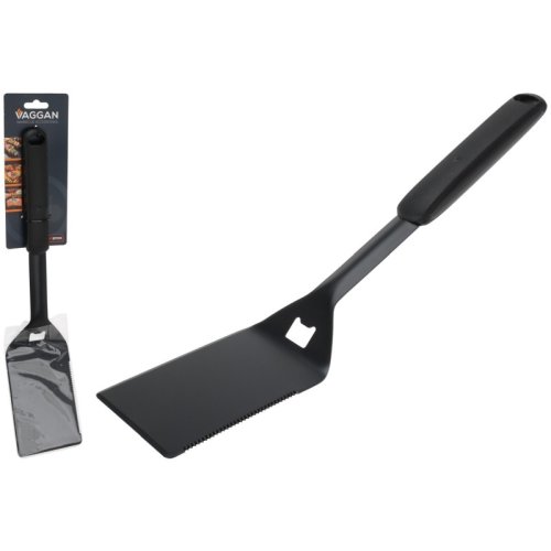 obracečka na grilování, celková délka 465mm s otvírákem na láhve v obracečce, tloušťka 1,8mm, černý nepřilnavý (ptfe) kov potažený (nerezová ocel ss430) s tpe a pp rukojetí 18cm