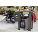 Hnědý grilovací stolek Unity značky Keter má kapacitu 105 litrů. Nerezová pracovní deska, praktická rukojeť s háčky na pověšení utěrek a kolečka pro přemisťování stolku dohromady vytvářejí dokonalé prostředí pro venkovní grilování.