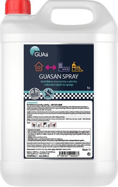 GUASAN SPRAY náhradní náplň - dezinfekce na povrchy a plochy. Tekutý dezinfekční prostředek k okamžitému použití pro rychlou dezinfekci ploch, předmětů, povrchů a těžko přístupných míst postřikem. Je charakteristický silným a dlouhotrvajícím antibakteriálním, antivirovým a protiplísňovým účinkem bez negativních vlivů na jakékoli ošetřované materiály (sklo, dřevo, kovy, plast, papír, textilie, gumu). Vlastnosti: Je nehořlavý, nekorozivní, neobsahuje chlór, alkohol, aldehydy ani fenoly. Účinky: Eliminuje široké spektrum mikroorganismů a má tyto účinky: baktericidní – včetně TBC (15–30 min), virucidní - včetně obaleného koronaviru (15–30 min) a protikvasinkové (60 min). Použití: Prostředek je určen k přímému použití a snadné aplikaci pomocí rozprašovače, neředí se. Nastříkejte na čištěnou plochu a nechte působit. Ošetřením vznikne na povrchu polymerová vrstva, která zabezpečí dlouhodobou ochranu před mikroorganismy. Povrch bezprostředně po ošetření neomývejte.