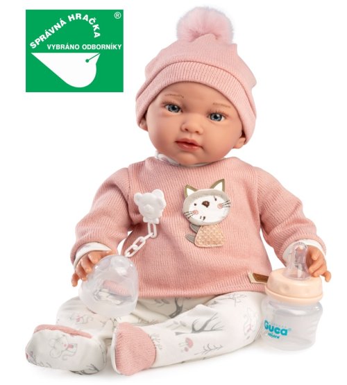 Zátěžová panenka miminko bez zvuku s měkkým látkovým tělem. Ruce a nohy jsou k tělu přichyceny kloubem. Miminko je polohovací a může i sedět, avšak díky zatížení hlavičky jsou její pohyby odlišné od ostatních miminek. Hlavička se jí na krku pohybuje v závislosti na celkové manipulaci s panenkou a v náručí se chová jako skutečné miminko, kterému je potřeba hlavičku ještě přidržovat. Díky zátěžovým výplním v hlavě a na zadečku má tento typ panenky miminka vyšší váhu oproti ostatním (cca 1800 g) a je vnímána jako manipulační panenka, která je vhodná nejen pro děti, ale i pro seniory nebo jako pomůcka pro inkluzi a osoby se speciálními potřebami. Tyto panenky se používají v ergoterapii, kde pomáhají rozvíjet jemnou motoriku a koordinaci u dětí i dospělých. Jsou také výborným pomocníkem při práci s lidmi s demencí, kde navozují klientům pocity klidu a bezpečí. Zátěžová výplň panenky: látkové pytlíky plněné křemičitým pískem. Velikost 42 cm. Ručně vyrobeno ve Španělsku, baleno v dárkové krabici. Doporučený věk od 3 let.
