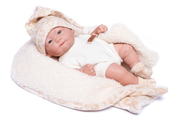 Miminko bez zvuku s vinylovým tělem s možností koupání, na kterém je zachycen doslova každý detail dětského tělíčka včetně roztomilých miminkovských faldíků a pohlaví. Ruce a nohy jsou k tělu přichycené kloubem. Miminko je polohovací a může i sedět. Velikost 25 cm. Ručně vyrobeno ve Španělsku, baleno v dárkové krabici. Doporučený věk od 3 let.