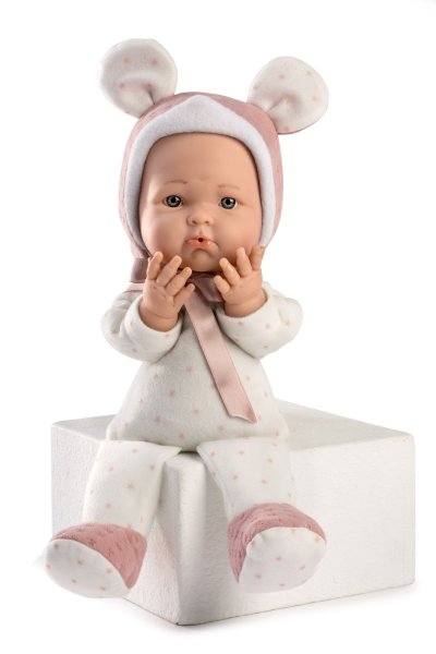 Ručně vyrobená španělská panenka miminko. Panenka má měkké látkové tělo, hlava a končetiny jsou vyrobené z kvalitního měkčeného vinylu. Velikost 36 cm. Baleno v dárkové krabici. Doporučený věk od 3 let.