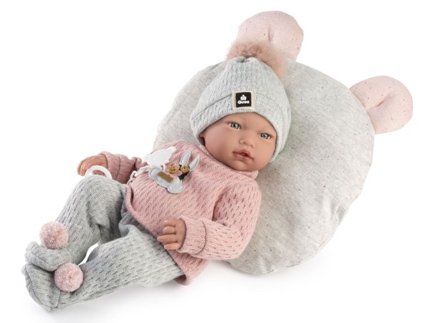 Zvuková panenka miminko s měkkým látkovým tělem, která po zatlačení na hrudník začne vydávat reálný zvuk smějícího se dítěte. Ruce a nohy jsou k tělu přichyceny kloubem. Miminko je polohovací a může i sedět. Dudlík v balení slouží pouze jako doplněk. Velikost 38 cm. Ručně vyrobeno ve Španělsku, baleno v dárkové krabici. Doporučený věk od 3 let. Součástí balení je 3 x knoflíková baterie LR44 s návodem na její výměnu. Baterie jsou spotřební zboží a proto jejich vybití není důvodem k reklamaci panenky.