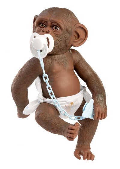 Veselé a roztomilé opičí miminko bez zvuku s vinylovým tělem s možností koupání, na kterém je zachycen věrohodně každý detail tohoto zvířecího mláďátka včetně různých záhybů, kromě pohlaví. Opičku lze koupat, ale je potřeba dát pozor, aby se jí nenamočily řasy. Odlepené řasy nejsou pak důvodem k reklamaci. Ruce a nohy jsou k tělu přichycené kloubem. Opičí miminko je polohovací a může i sedět nebo se dá pověsit za ruce nebo nohy. Dudlík v balení slouží pouze jako doplněk. Velikost 32 cm. Ručně vyrobeno ve Španělsku, baleno v dárkové krabici. Doporučený věk od 3 let.